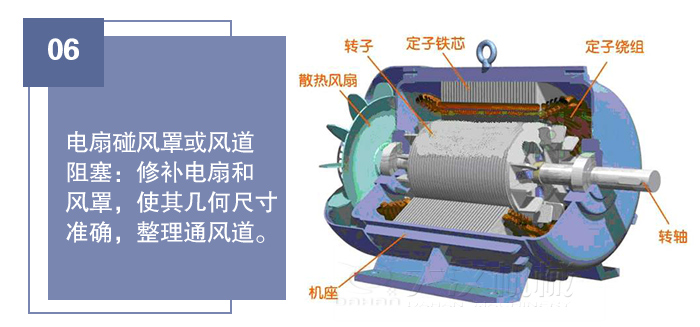 9、電扇碰風(fēng)罩或風(fēng)道阻塞:修補電扇和風(fēng)罩,使其幾何尺寸準確,整理通風(fēng)道。