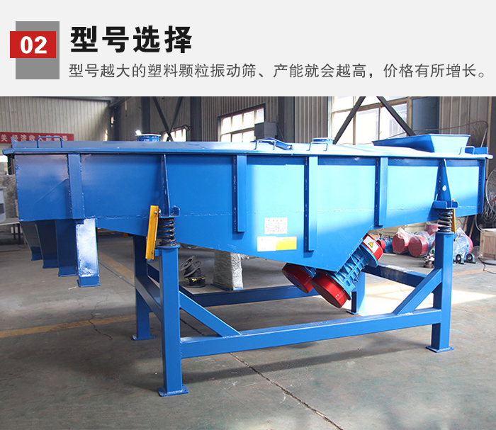 2、型號選擇:各種塑料顆粒振動篩型號多樣,型號越大的塑料顆粒振動篩、產能就會越高,相應的價格也會有所增長。