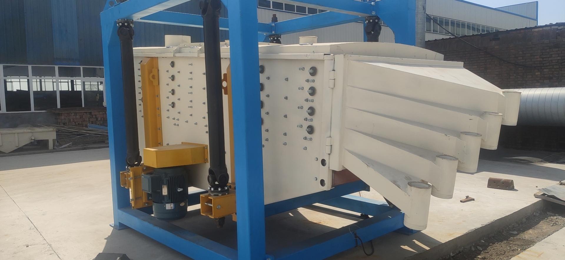 進(jìn)料口改變了原來(lái)依附在后門上的設(shè)計(jì),增加分料板結(jié)構(gòu)使進(jìn)料也越發(fā)簡(jiǎn)單快捷、分料更有效均勻,觀察孔用來(lái)控制物料篩分精度和堵網(wǎng)情況;出料口位于方形搖擺篩斜下方,可以根據(jù)客戶的物料篩分需要進(jìn)行各種不同設(shè)計(jì)通過(guò)改變出料口的角度、長(zhǎng)度、料管直徑等方式,適應(yīng)各種性狀物料流出篩體。