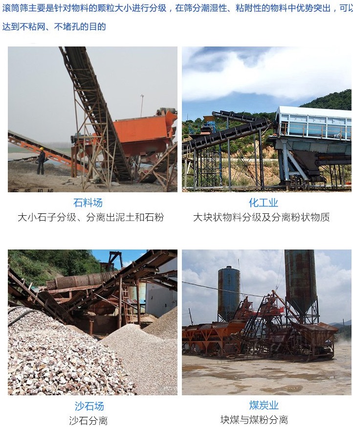 滾筒篩由一個(gè)穿孔的圓柱形滾筒組成,該滾筒通常在進(jìn)料端以一定角度升高,當(dāng)進(jìn)料沿旋轉(zhuǎn)滾筒螺旋向下時(shí)實(shí)現(xiàn)物理尺寸分離,其中小于篩孔的尺寸過小的材料通過篩網(wǎng),而尺寸過大的材料從滾筒的另一端排出,用于粘性和纖維材料的分類,例如在煤炭或天然石材工業(yè)中。