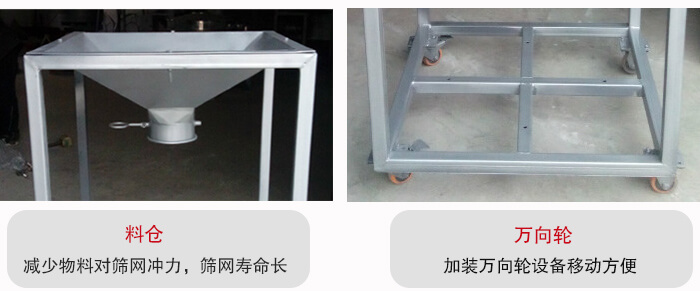 移動(dòng)式料倉(cāng)振動(dòng)篩又叫振動(dòng)篩料倉(cāng)一體機(jī)底部加裝萬(wàn)向輪,可360度旋轉(zhuǎn)移動(dòng)。
