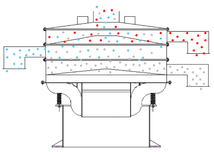 2、回旋式逆向篩分:物料篩分由細→中細→中→粗的方式篩分,粗物料起到一定的清潔網(wǎng)孔的作用。