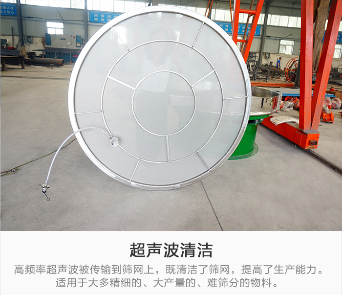 超聲波清潔:高頻率超聲波被傳輸?shù)胶Y網(wǎng)上,既清潔了篩網(wǎng),又顯著提高了生產(chǎn)能力。適用于大多精細的、大產(chǎn)量的、難篩分的物料。