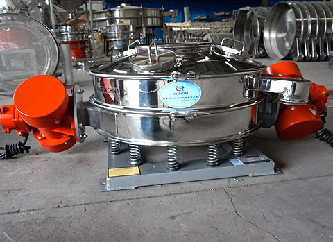 直排篩利用振動(dòng)電機(jī)利用其軸上下端的兩組偏心塊(不平衡偏心塊)的相位角以及兩臺(tái)電機(jī)之間的交叉角度將振動(dòng)電機(jī)的旋轉(zhuǎn)運(yùn)動(dòng)變?yōu)樗?、垂直、傾斜以及離心作用的多作用力重疊,再將這種作用力傳遞給篩面,從而達(dá)到篩分的目的。改變上下偏心塊的相位角和重量,可以改變激振力的大小和物料的運(yùn)動(dòng)軌跡。